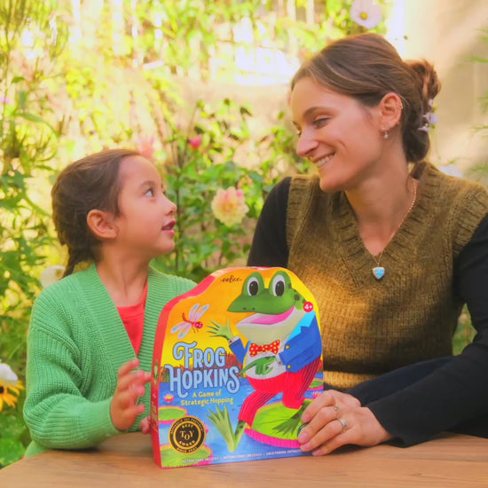 A simple, satisfying game of spatial intelligence and strategic blocking. Players take turns placing and hopping their own frogs to earn dragonflies. Easy instructions and scalable rules engage the whole family for any level of play. Featuring fresh, playful artwork by Linda Bleck.