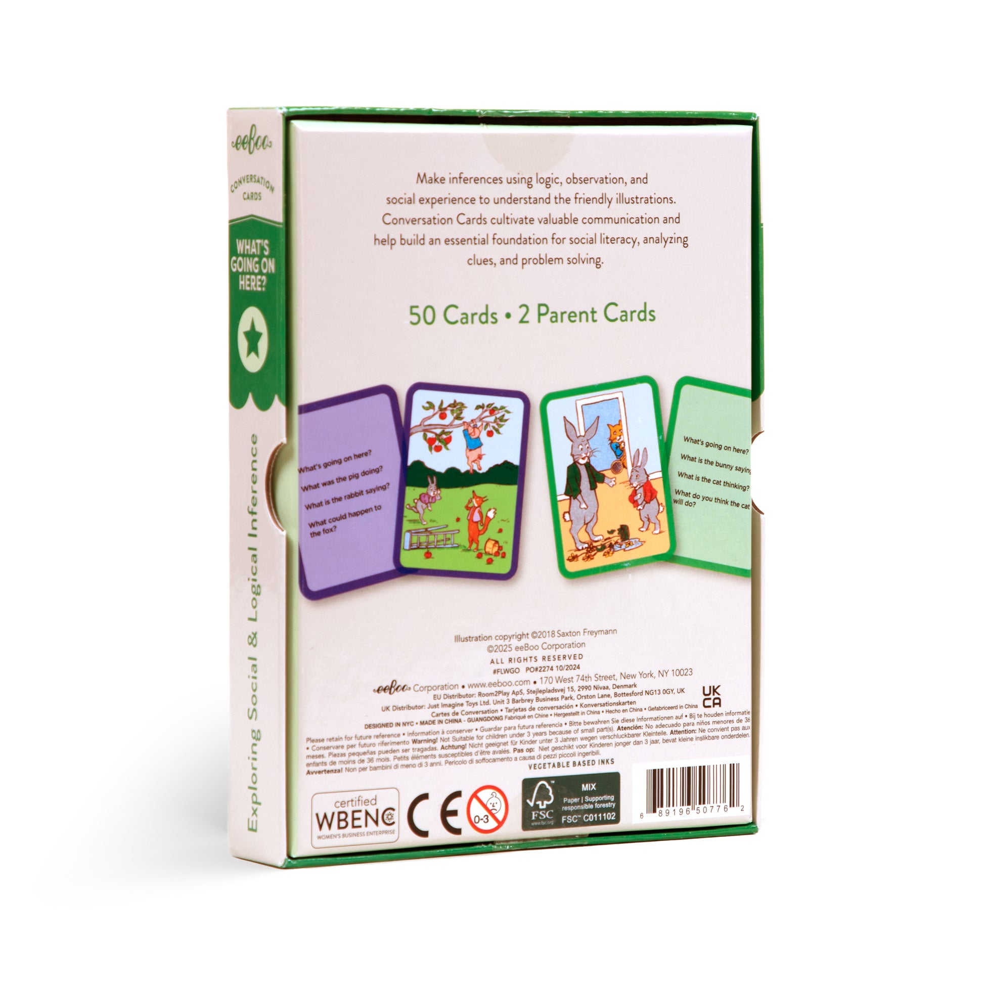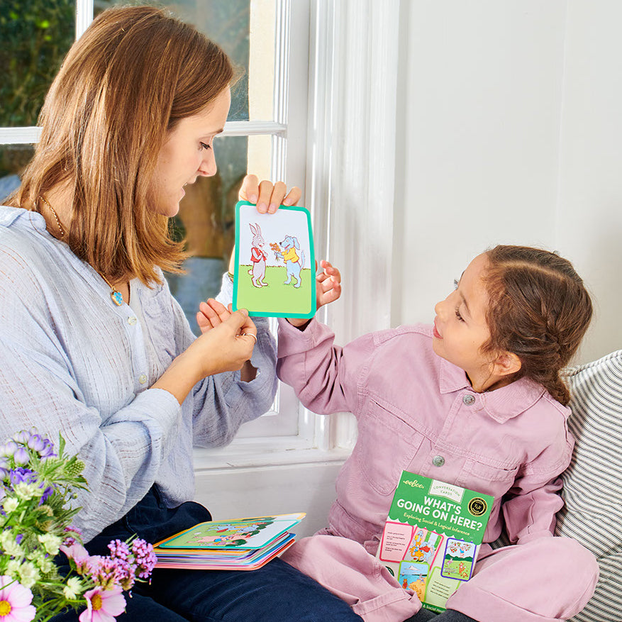 What's Going On Here? conversation cards help us to understand the friendly illustrations by making inferences using logic, observation, and social experience. What's Going On Here? conversation cards cultivate valuable communication skills and help build an essential foundation for social literacy, analyzing clues, and problem solving. The cards deploy artwork by Saxton Freymann, delightfully demonstrating a broad range of emotions and situations.